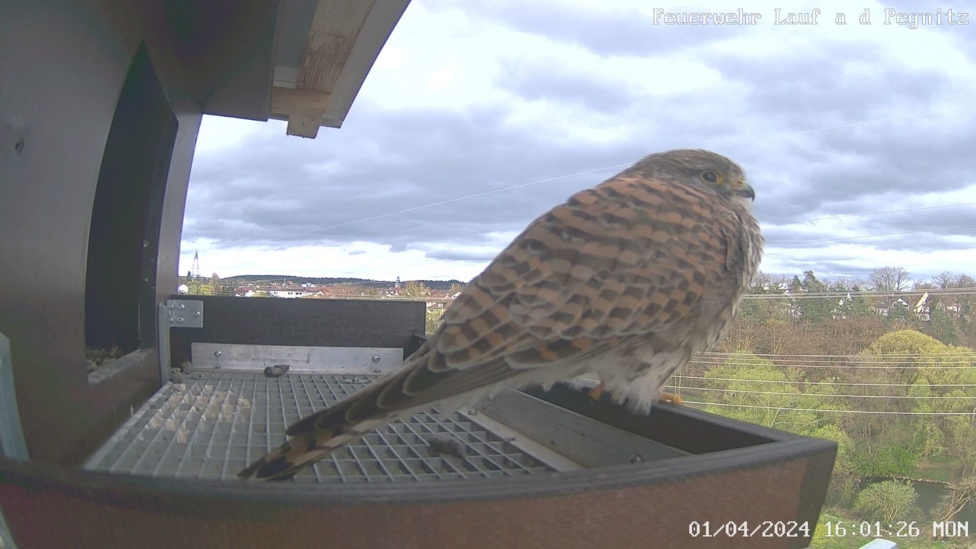 Am 17. April war es dann endlich so weit: Der erste Turmfalkenterzel besichtigte unseren Falkenkasten ausführlich. Bereits am nächsten Tag zog er mit seinem Weibchen im Kasten ein.